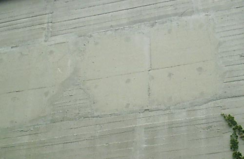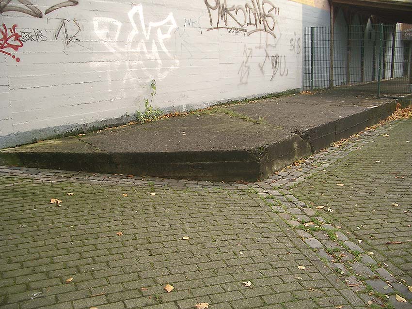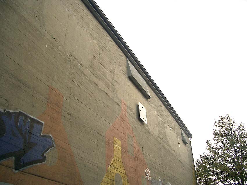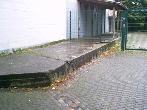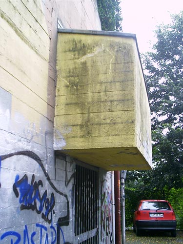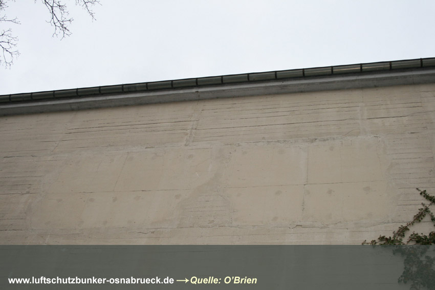 Eine von mehreren bombenabweisenden schrägen Betonplatten an den Außenwänden des Bunkers am Dachbereich...