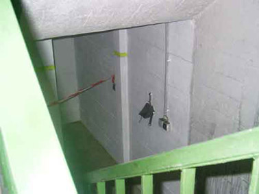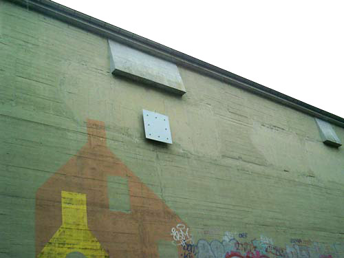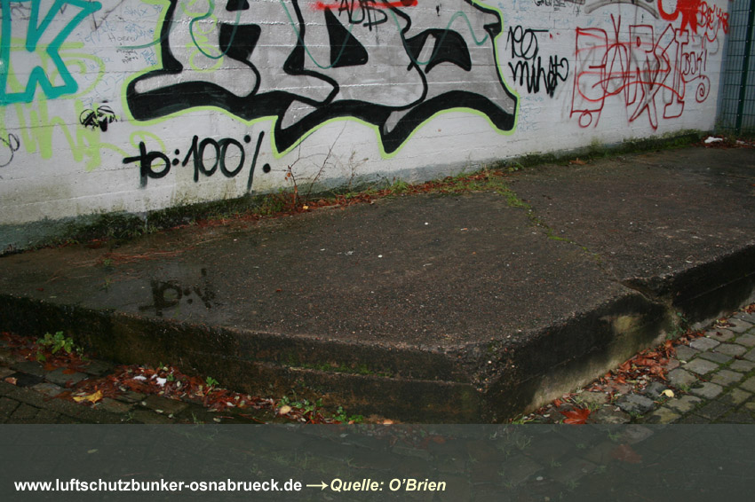 Hierunter hat sich ein Lüftungsschacht befunden. Mittig dieser Wand befindet sich eine weitere, breitere Platte. Hierunter befindet sich ein im Zuge der Wiederherrichtung eingebrachter Luftschacht. Original werden dort zwei nebeneinanderliegende Schächte gewesen sein. Weiter nördlich an der Wand ist wiederum eine schmale Platte - gefertigt in gleicher Art wie hier auf dem Bild - angebracht, auch dort ist ein Lüftungsschacht unter der Platte vorhanden gewesen. Die gleiche breite Platte findet sich an der gegenüberliegenden Stirnseite des Bunkers mittig.