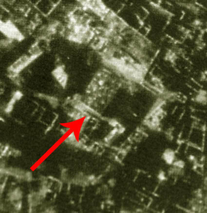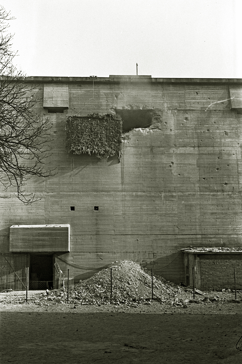 Der Hochbunker im noch entfestigten Zustand aus der Luft. Auffällig ist der Lüftungsturm, welcher durchaus Ähnlichkeit mit denen der Kriegsmarine-Truppenmannschaftsbunker hat...