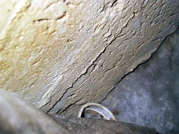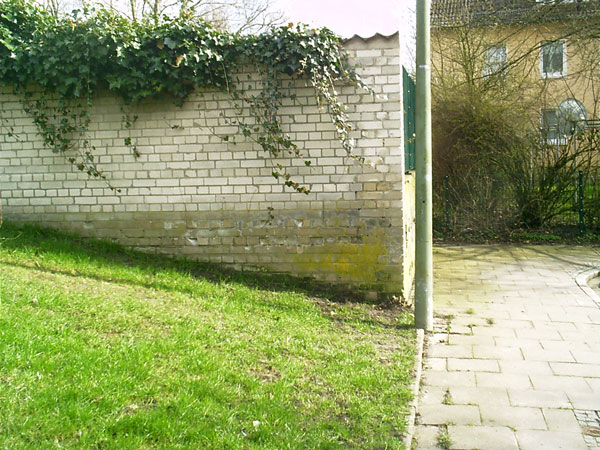 Blick in die Öffnung. Sie ist verfüllt. Wir gehen momentan davon aus, dass der ganze Graben verfüllt wurde. Eindeutig ist die diagonal nach unten laufende Deckenbetonschalung der Öffnung zu erkennen!
