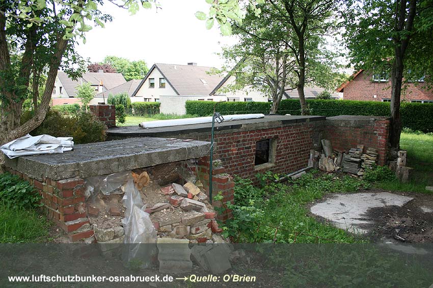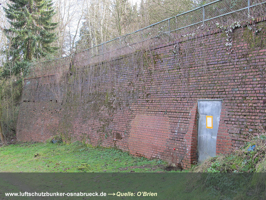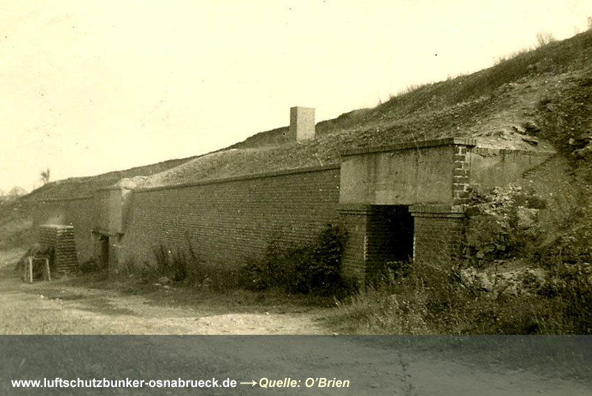 Auf dem oberen Foto ist der ursprüngliche Eingang 1 und 2 Feldstraße abgebildet. Die Aufnahme stammt von 1948, kurz vor der Sprengung dieser beiden Portale durch die Engländer. Die ersichtlichen Sandsäcke links dienten als Schutz vor Trümmerflug aus dem Stollen während der Detonation. Die beiden Betonquader über den Eingängen sind aufgrund Hinweisen nach der Sprengung heruntergefallen, begruben die Eingänge unter sich und liegen noch heute dort im Erdreich begraben. Die gesamten Vorportale brachen zusammen. Später wurden dann in den 1980er Jahren die beiden Eingänge neu geöffnet und mit Türen versehen.
