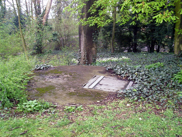 Bunker neben dem Gartenhäuschen (existiert hier eventuell ein vierter noch vorhandener Zugang zur Höhle?). Diese ursprünglich als Eiskeller errichtete Anlage wurde im Krieg als LS-Raum genutzt...