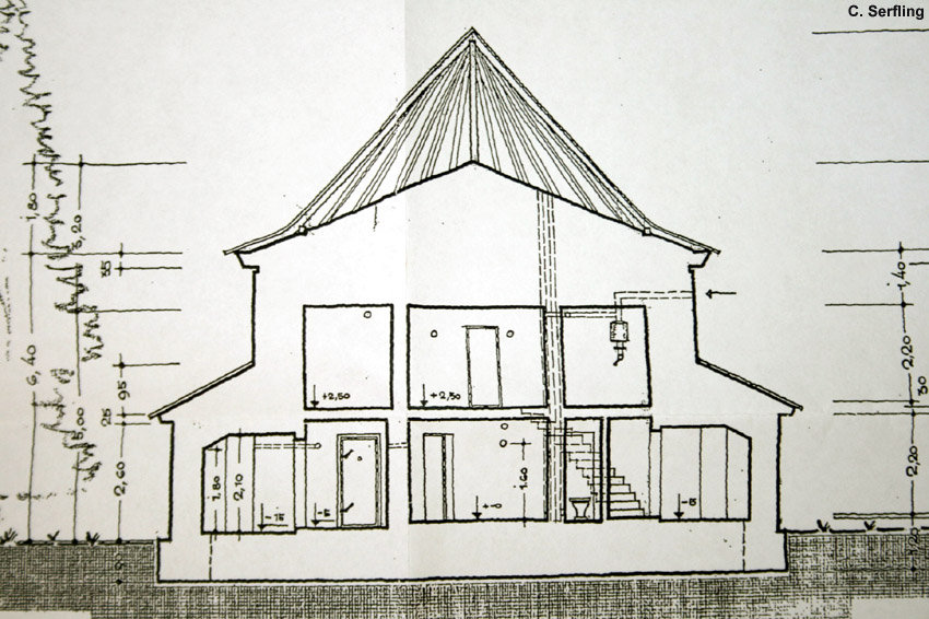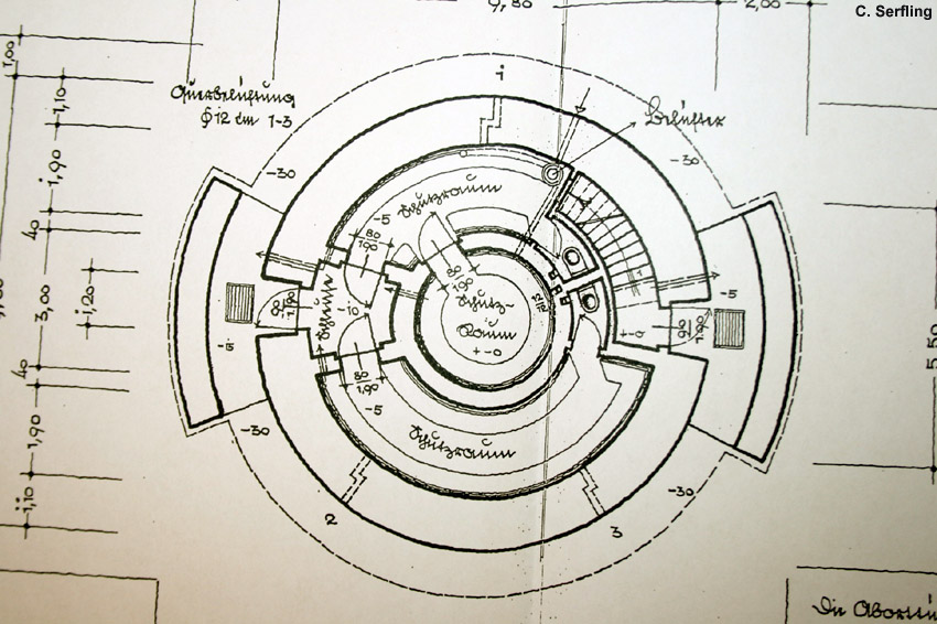 So hätte der LS-Turm ungefähr ausgesehen, wenn er nach dem Krieg verblendet worden wäre. Nur hat er ein Geschoss mehr als in der Zeichnung besessen. Die Skizzen zeigen einen nur geplanten, verblendeten Bunker dieses Typs im Bereich Eversburg-Haste: