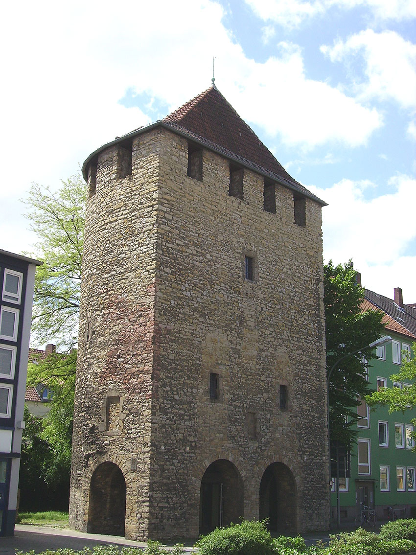 "Der ehemalige Wachturm der Stadtbefestigung wurde während des Krieges zum Schutzbunker ausgebaut. Zwischen 1980 und 1984 wurden die über 1 m dicken Betondecken entfernt. Das THW versuchte hier mit einer Sauerstofflanze ein Loch in die Betondecke zu brennen, was auch gelang. Durch eine Abbruchfirma aus Osnabrück wurde dann die Decke Stück für Stück herausgesprengt."