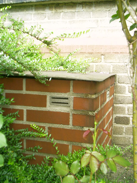 Dieser Mauerblock befindet sich vor einem Kellerfenster in der Nähe der Pfeile. Er könnte etwas mit LS-Zwecken zu tun gehabt haben, obwohl das Mauerwerk jedoch neueren Datums zu sein scheint. Blick in den Schacht zum Fenster: