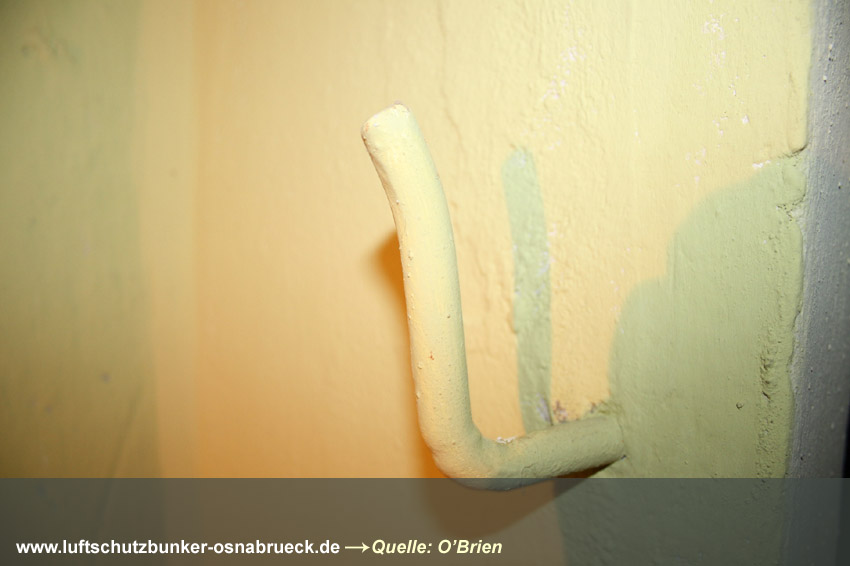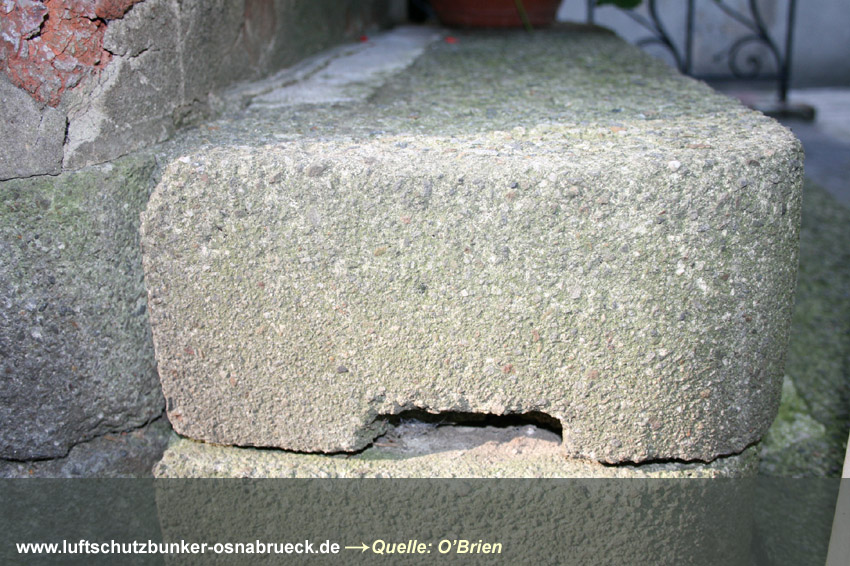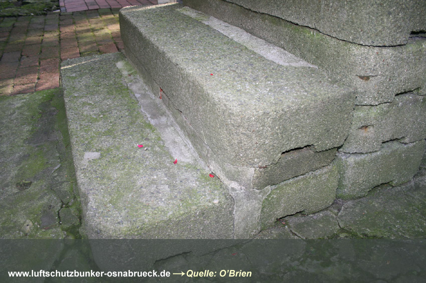 Drei weitere Blöcke sind aber hier noch vorhanden geblieben: Neben der Treppe fanden sich beim Abriss mehrere gestapelte Fertigbetonteile, die auch für die Deckenfertigung von Osnabrücker Deckungsgräben verwendet wurden. Sie waren nach 1945 zusammen / im Wechsel mit den drei weiteren - am Ort noch existenten - Blöcken / Blenden für die Wand eines Nachkriegsschuppens verbaut worden.