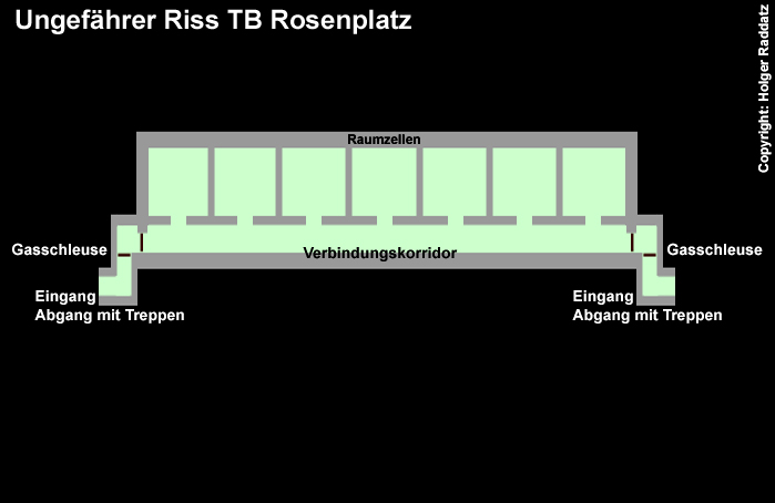 Nachtrag 08.09.12: Entgegen der Skizzen besaß der Tiefbunker Rosenplatz laut glaubwürdiger Quelle 12 statt 7 Raumzellen.